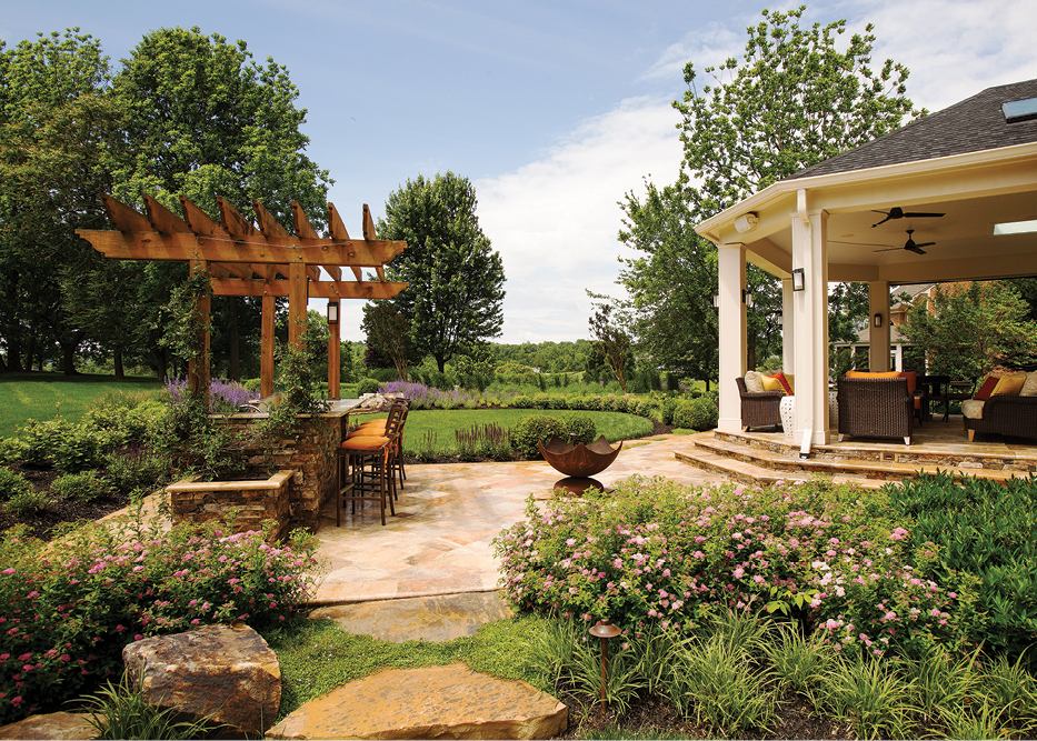 Porch and kitchen – The physical relationship between the porch and the kitchen/bar sets up a series of casual gathering area amid open landscaping. The porch/patio continuum can comfortably handle 35 to 40 people. A pair of rotating fans keep the porch cool on particularly humid days. The porch is also wired with a sound system.